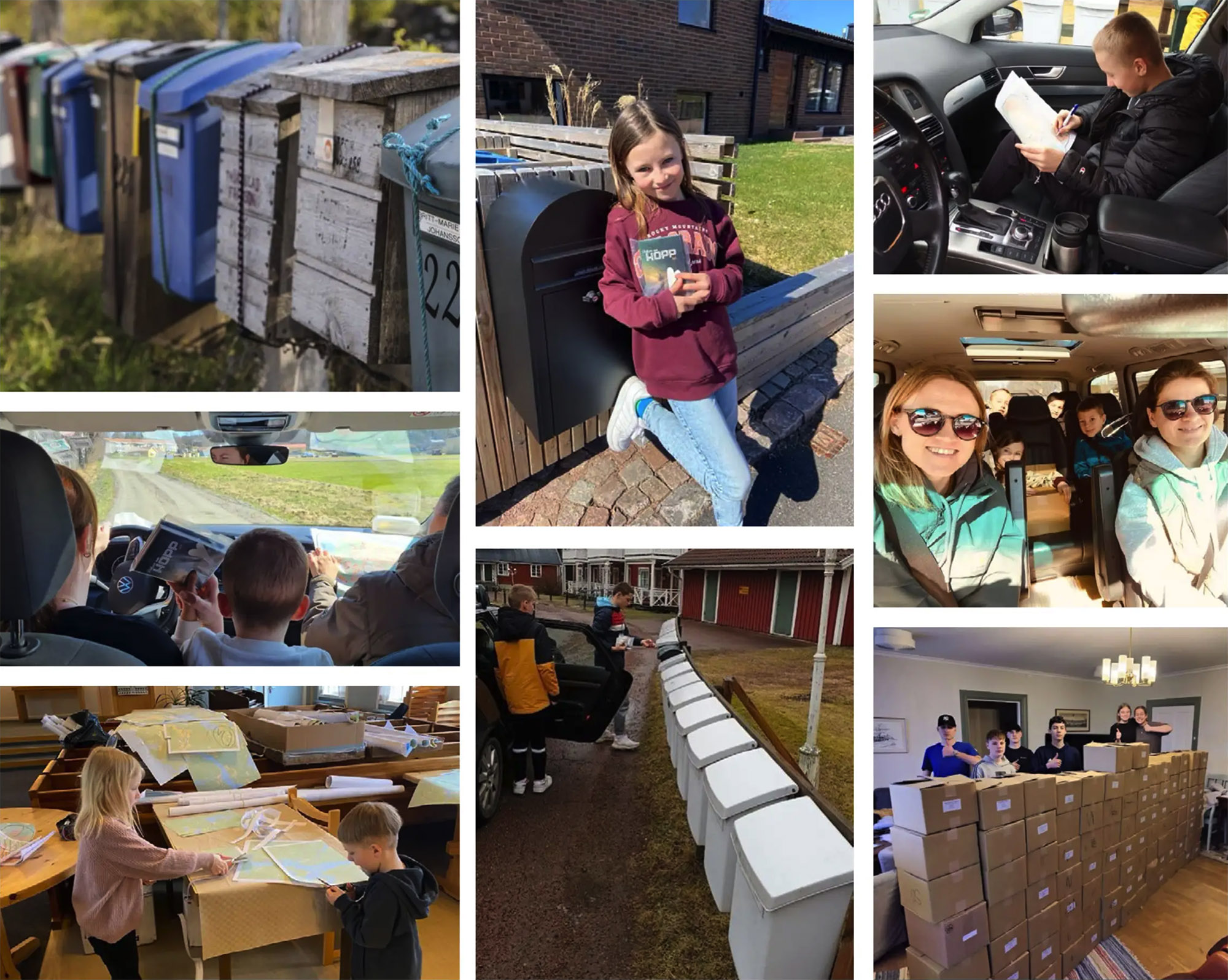 Brevlådemissionen har fått hjälp av frivilliga krafter från Tyskland för att dela ut biblar i Värmland. De har packat 4 000 biblar på en dag. (foton: Brevlådor högst upp till vänster, Martina Holmberg/TT, Brevlådemissionen)