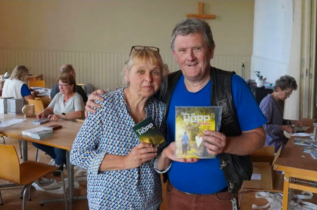 Roul och Birgit Åkesson står i spetsen för Brevlådemissionen. Här håller de fram "Boken om HOPP" och "Boken om HOPP för barn". (Foto: Jenny Antonsson)