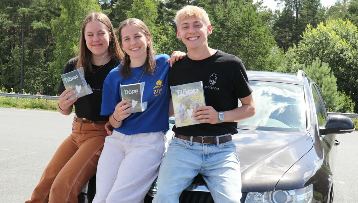 För tredje sommaren i rad är 21-åriga Maxim Neufeld (till höger) i Sverige och delar ut biblar, medan det är andra sommaren i rad som hans föräldrars bil får följa med. För 18-åriga Naemi Minich (till vänster) och 17-åriga Evelyn Wall (i mitten) är det första gången. (foto: David Spånberger)
