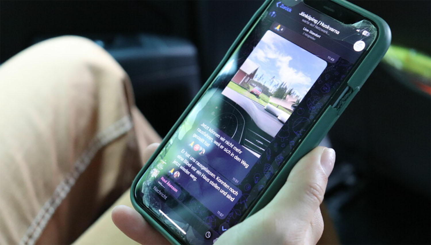 Vid ett tillfälle stöter en av de andra utdelningsgrupperna på patrull i form av en man i en röd bil som blockerar vägen för dem, vilket de berättar om i en gemensam gruppchatt, som Naemi visar upp på sin telefon. (foto: David Spånberger)